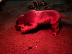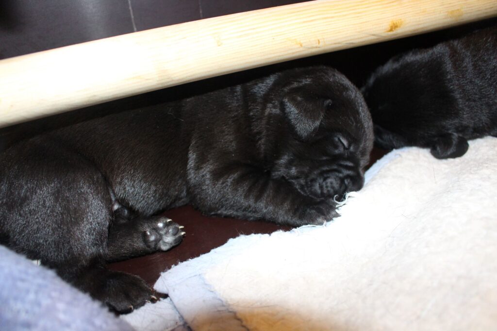 Hvalpene er 2 uger i dag. Et par stykker er allerede ved at få øjne og de forsøger vældig meget at komme op på benene at gå. Nogle stærke og dejlige basser.