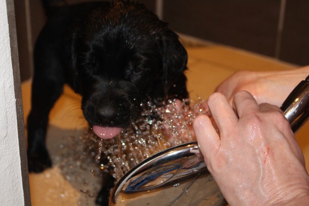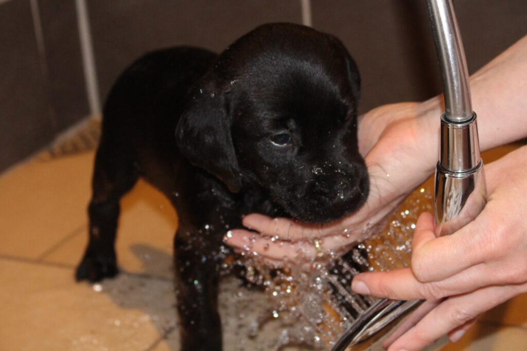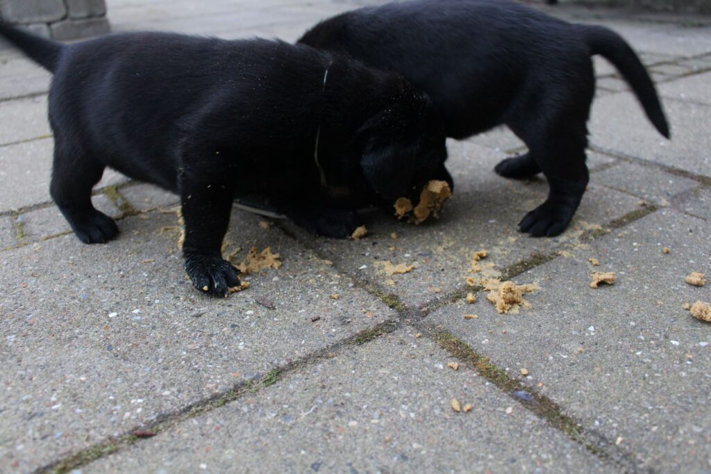 Der er sket rigtig meget med hvalpene i denne uge. De har alle fået øjne og samtidig begynder deres balance på benene at blive meget bedre. I går blev de for første gang præsenteret for hvalpefoder (blended). De var helt vilde med det – der var mad over alt på gulvet og ikke mindst på alle hvalpe. Derfor fik de også deres første bad…hvilket de faktisk nød rigtig meget.